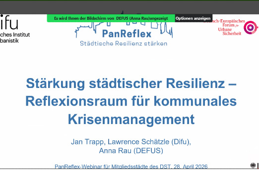 Das Deutsche Institut für Urbanistik (Difu) und das Deutsch-Europäische Forum für Urbane Sicherheit (DEFUS) haben die Ergebnisse ihres mehrjährigen Forschungsvorhabens zum kommunalen Krisenmanagement veröffentlicht. Die Ergebnisse haben sie nun exklusiv den Mitgliedstädten des Deutschen Städtetages (DST) in einem Webinar vorgestellt. Die 72 Teilnehemnden Vertreter:innen aus zahlreichen Kommunen zeigten großes Interesse an dem Thema der kommunalen Resilienz.