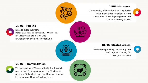 - Projektarbeit: DEFUS beteiligt sich an nationalen und europäischen Praxis- und Forschungsprojekten und erleichtert auch seinen Mitgliedern den Zugang zu Fördermitteln. An der Schnittstelle zwischen Praxis uns Wissenschaft vermittelt DEFUS kommunale Bedarfe in die Sicherheitsforschung und wissenschaftliche Erkenntnisse in die Kommunalverwaltungen. Ein zentrales Anliegen ist es, dass Sicherheitsforschung so anwenderorientiert wie möglich zu gestalten.