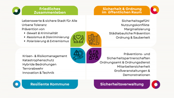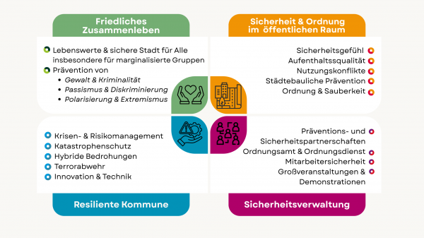 Gemeinsam arbeiten die Mitglieder daran, Ordnung, Sicherheit und das friedliche Zusammenleben in den Städten zu organisieren und an aktuelle Herausforderungen und Entwicklungen anzupassen. Mitarbeitende aus den Mitgliedskommunen tauschen sich hier praxisnah aus, diskutieren und entwickeln Lösungen und profitieren von der Vernetzung untereinander und mit Fachexpert*innen.