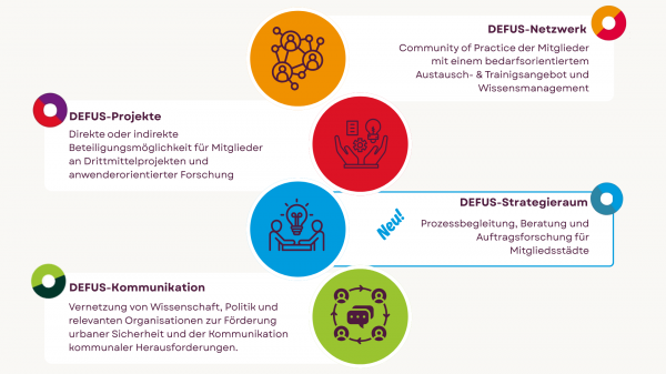 DEFUS ist das zentrale Netzwerk für kommunale Sicherheit und Prävention in Deutschland, in dem sich die Mitglieder sich über Landes- und Stadtgrenzen hinweg zu drängenden Sicherheits- und Präventionsfragen austauschen.
