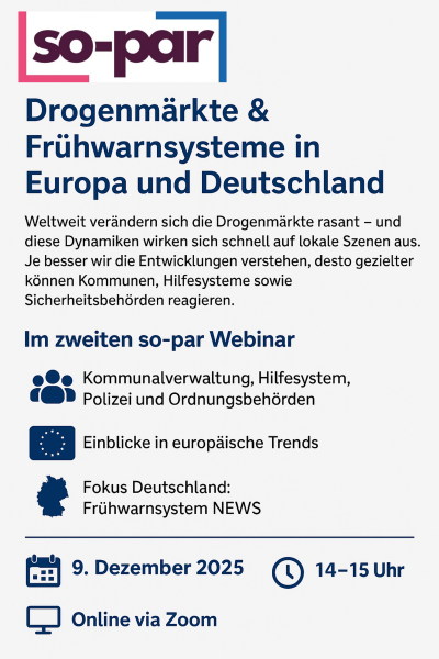 Dezember09.12.2025 - 09.12.2025 in Online | 14 - 15 Uhrso-par Webinar: Drogenmärkte und Frühwarnsystem in Europa und DeutschlandWeltweit entwickeln sich die Drogenmärkte konstant und rasant weiter. Diese Veränderungen spiegeln sich nach kürzester Zeit auch in den Drogenszenen vor Ort wider. Je mehr wir über die Veränderungen wissen, desto besser können Kommunen, Hilfesystem und Sicherheitskräfte auf darauf reagieren.